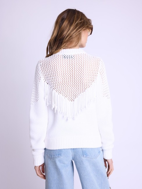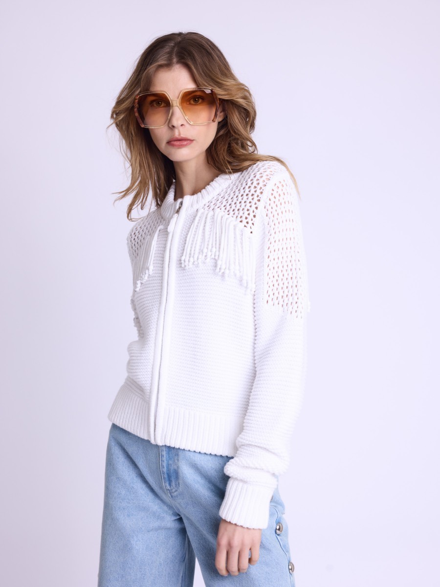 Il est doté d'un col rond et d'un zip sur le devant, ses franges et son effet de transparence ajoutent une touche de "rétro cool" au gilet.