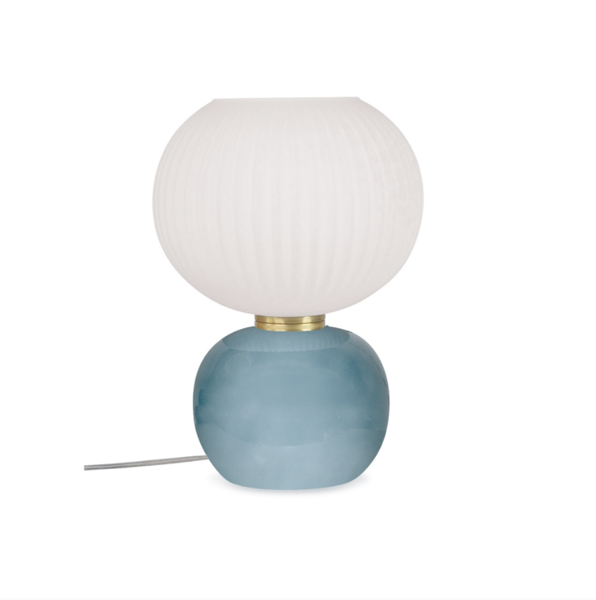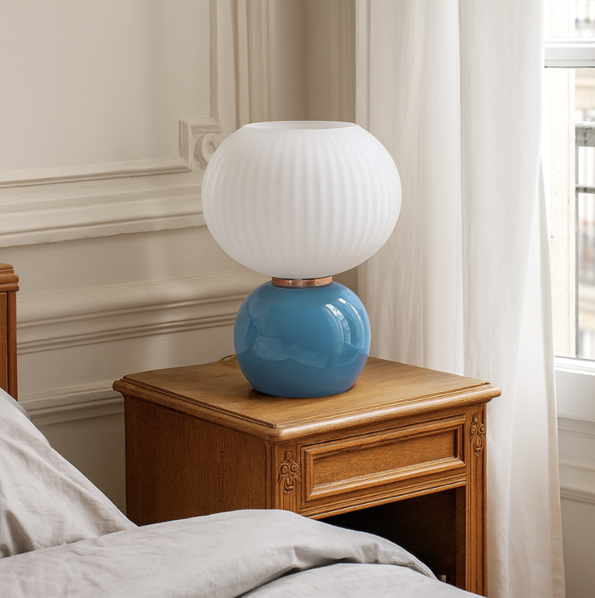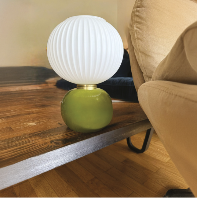 Lampe de bureau décorative avec socle en verre brillant et abat jour en verre mate strié blanc.