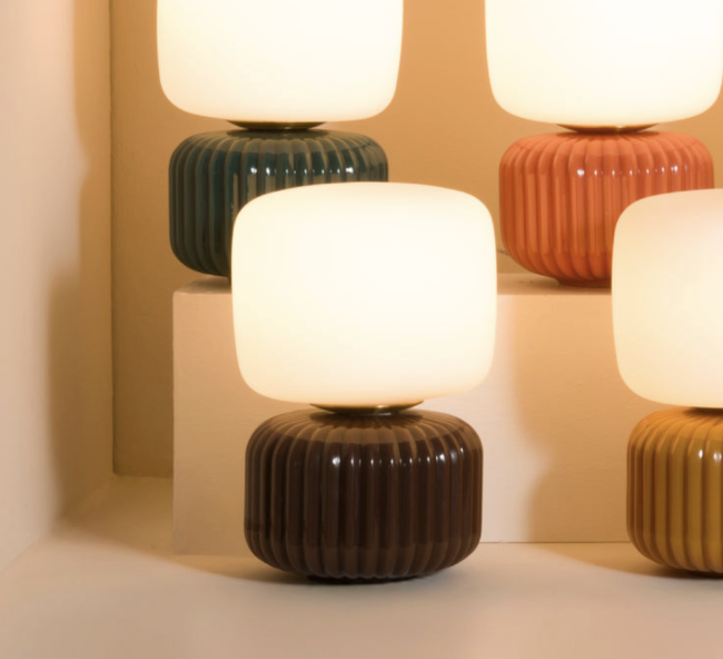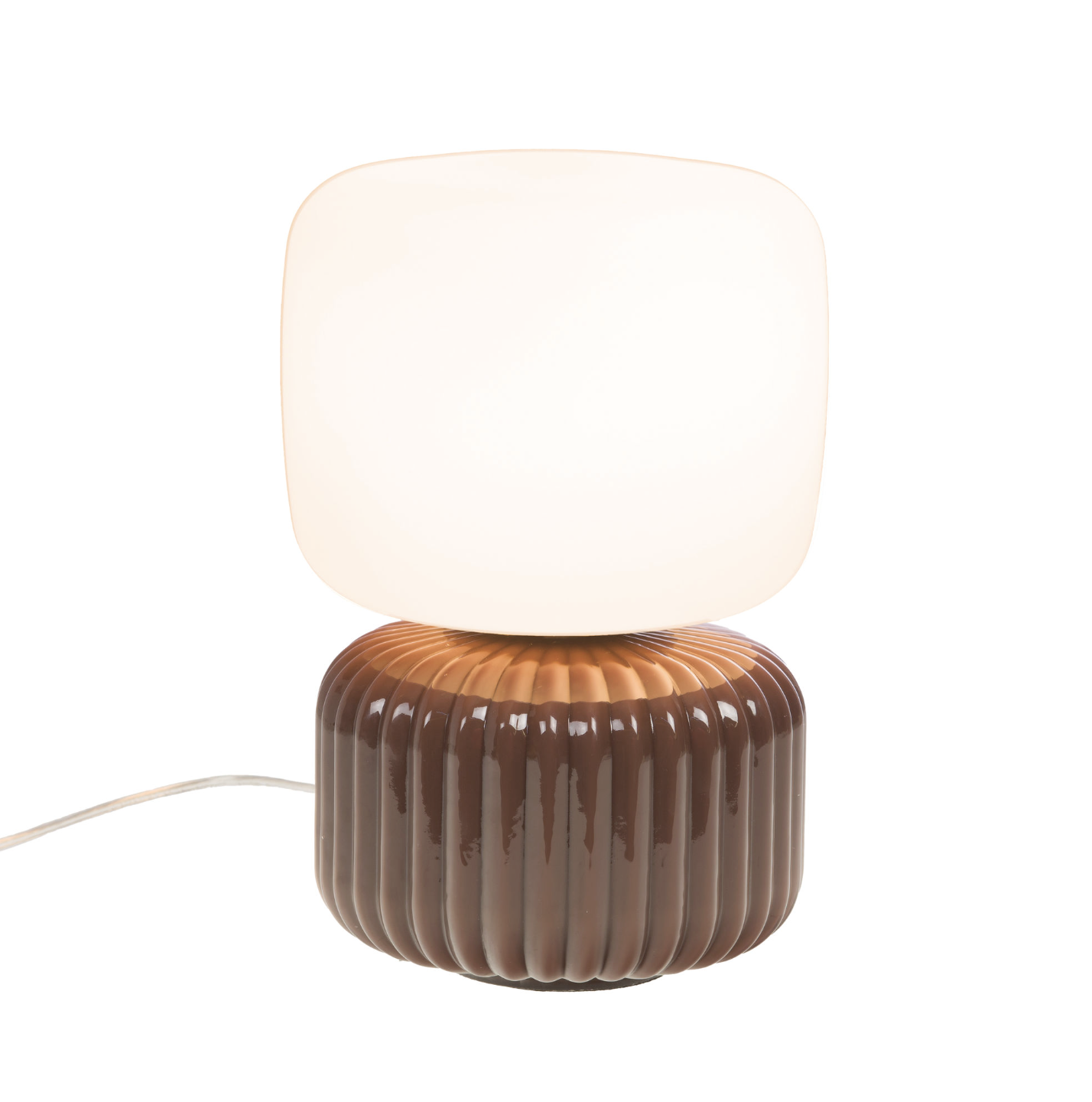 Lampe de chevet "Ninon marron" alliant verre opalin et base en céramique nervurée couleur marron.
