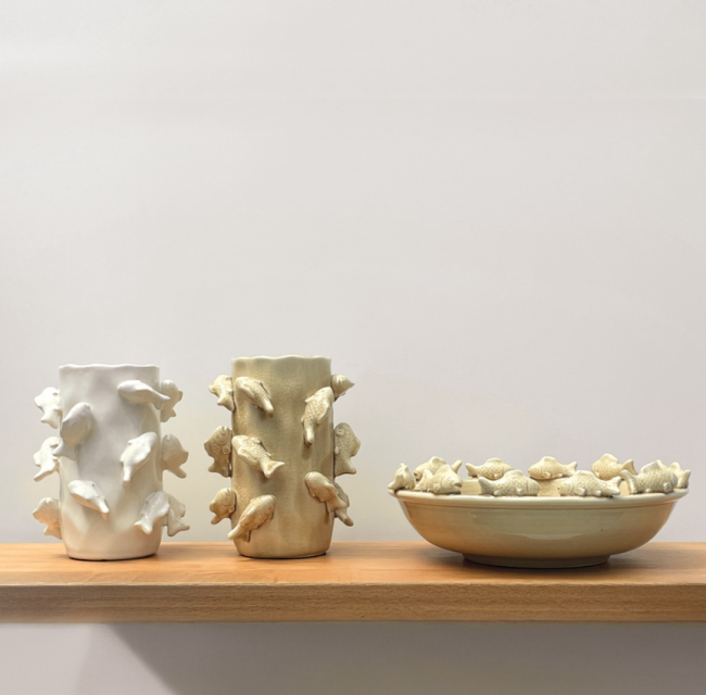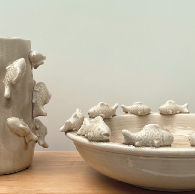 Vase en céramique sable décoré de nombreux petits poissons en relief, au style ludique et attachant.