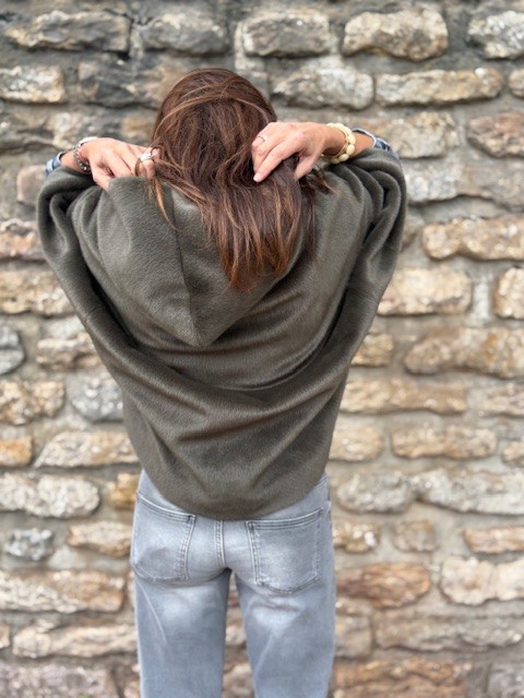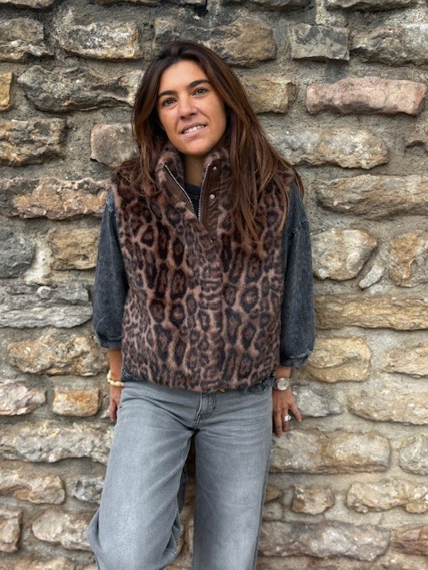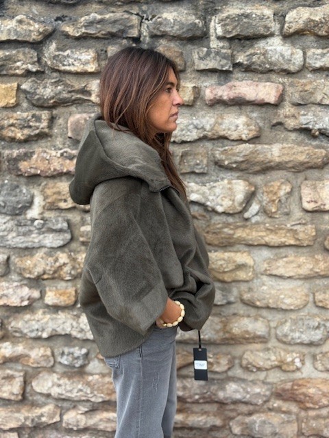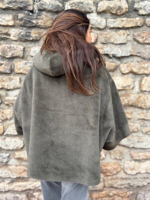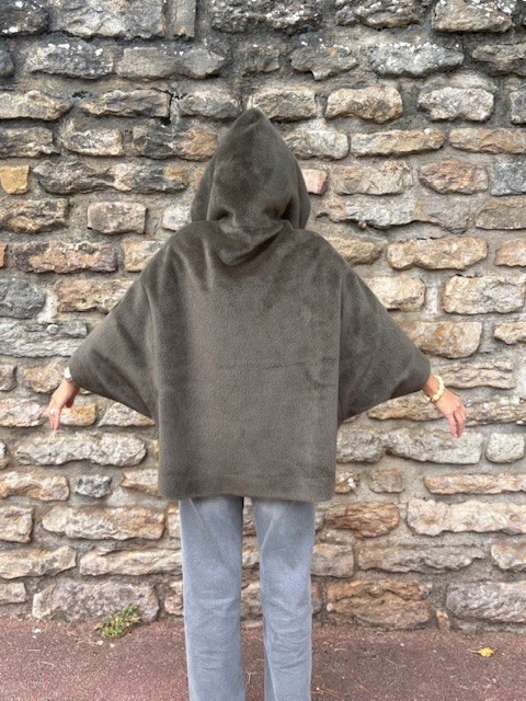 Cape courte en fausse fourrure avec une capuche et une fermeture à zip.