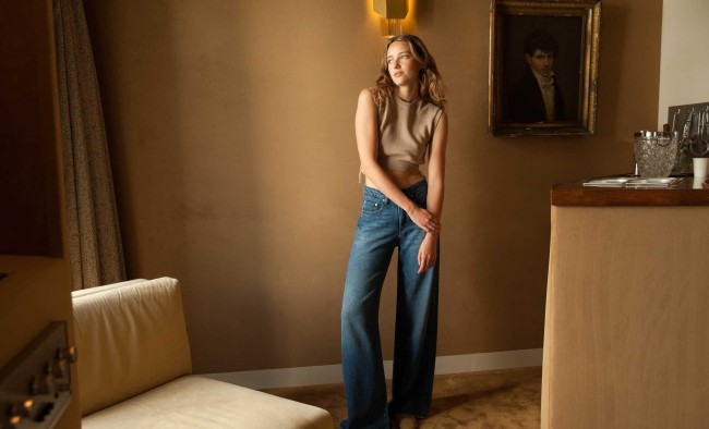 Pantalon wide leg, longueur 32″ (81cm), taille haute, 5 poches.