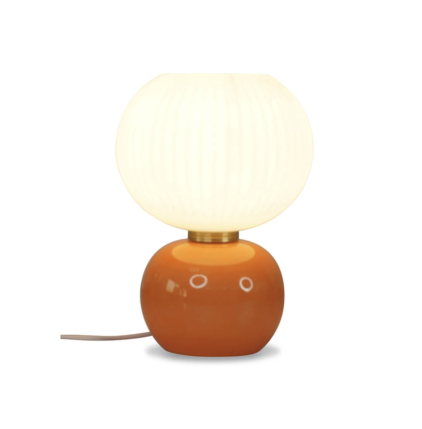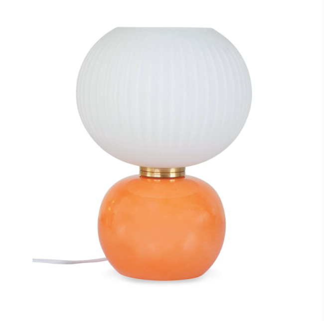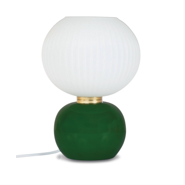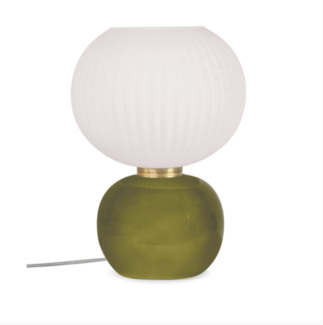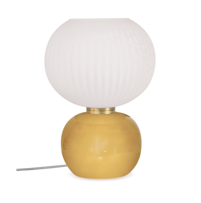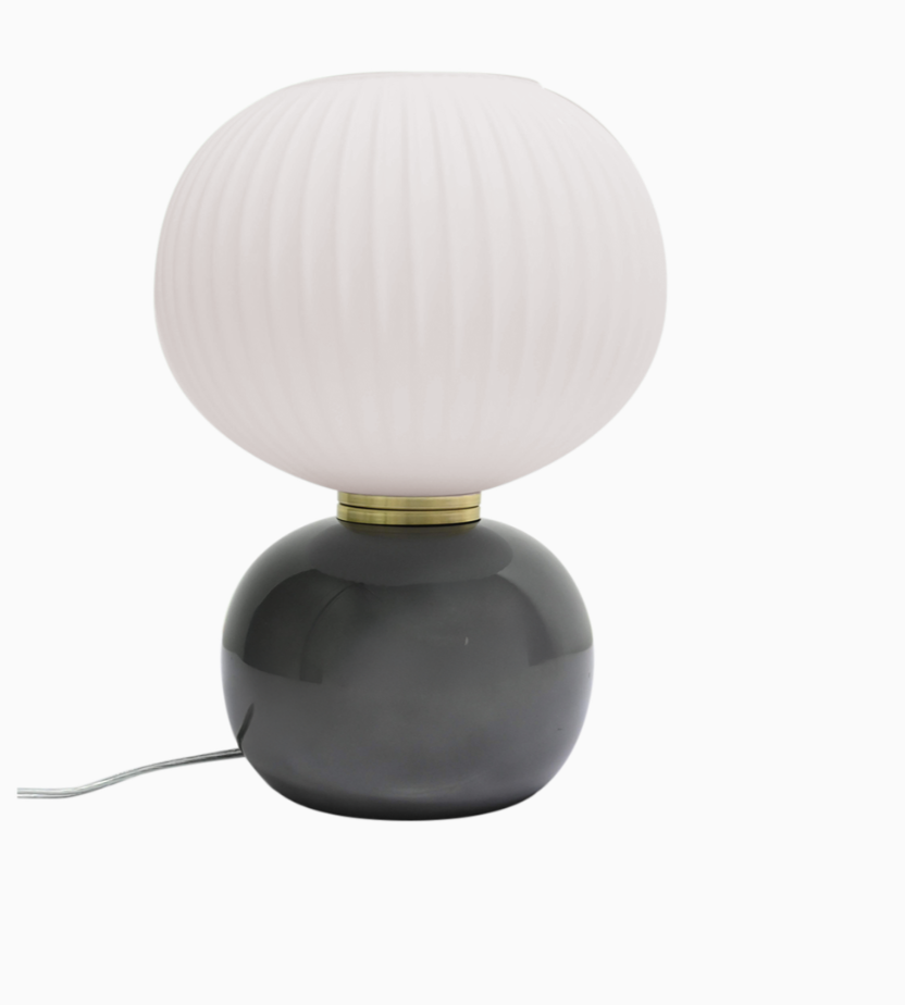 Lampe de bureau décorative avec socle en verre brillant et abat jour en verre mate strié blanc.
