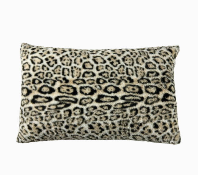 Un coussin en imitation fourrure naturelle motif léopard.