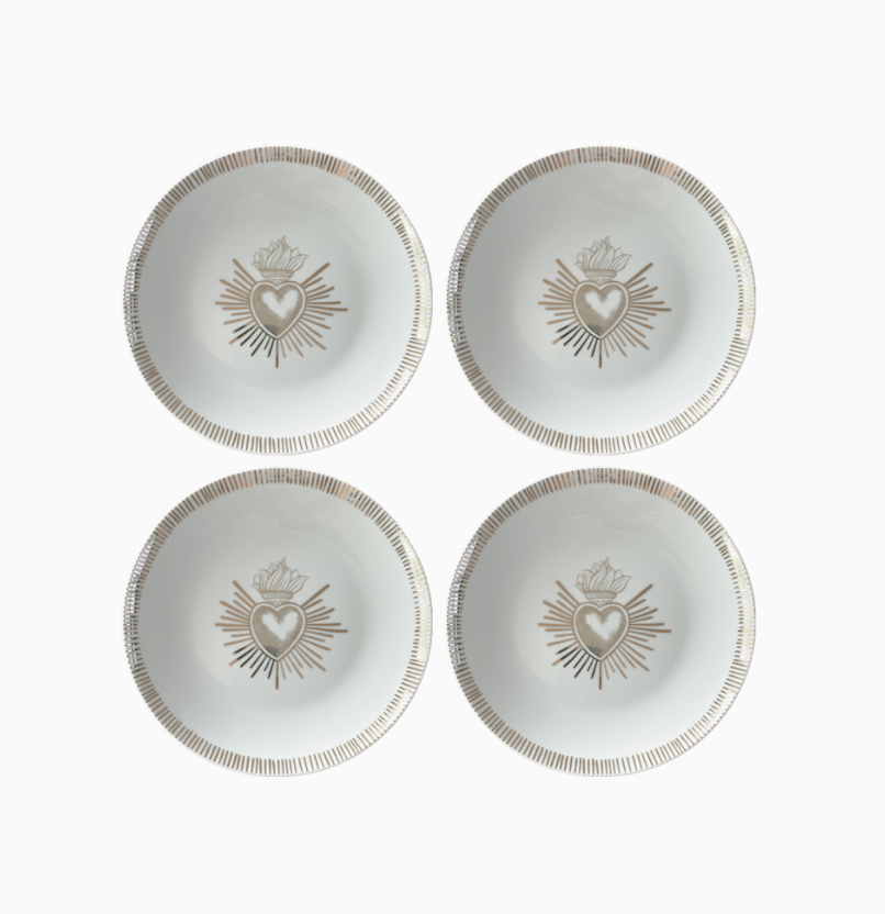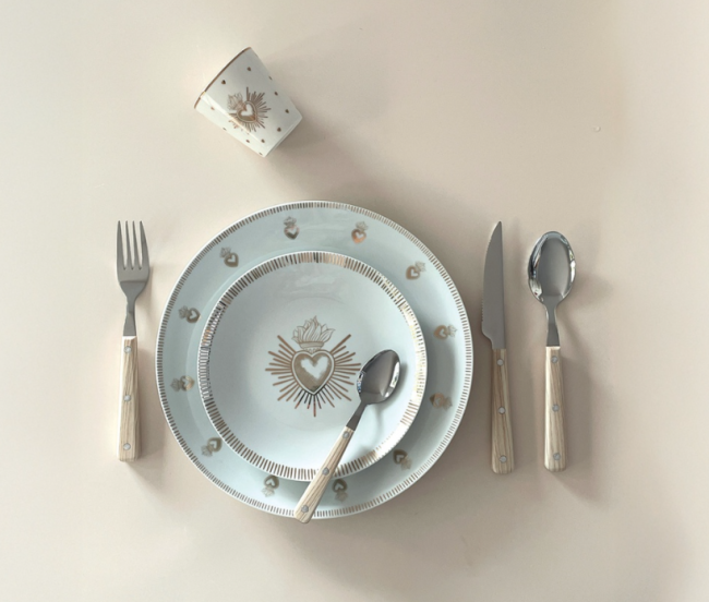 Réalisées en faïence fine, ces assiettes se distinguent par leurs motifs délicatement rehaussés de dorures, qui rappellent l’univers poétique des ex-voto, ces objets porteurs de vœux et de gratitude.
