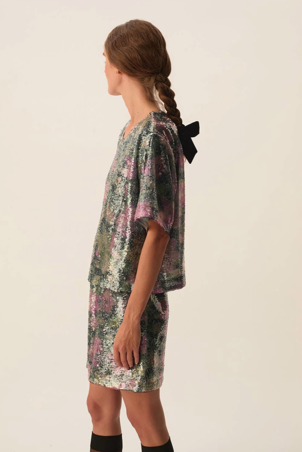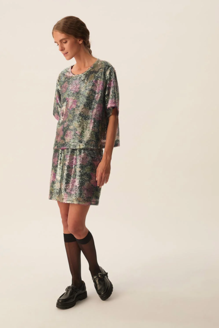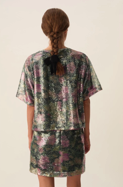 Pluie de sequins et motif floral opulent, le t-shirt Honorée redéfinit le style bohème avec audace. Coupe courte et volume large pour une silhouette ultra contemporaine, un modèle électrisant à porter en duo avec la jupe pour briller de jour comme le soir.