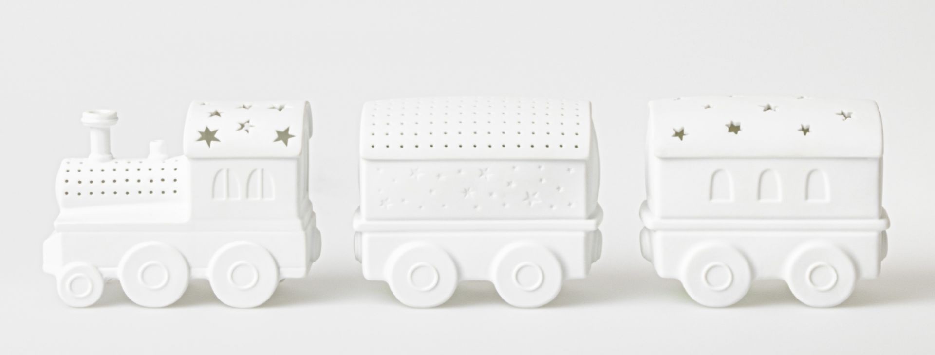 Il est composé de porcelaine blanche non émaillée et les wagons mesurent 12,5 cm chacun.