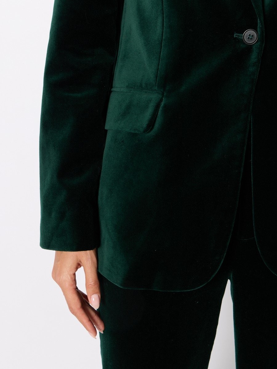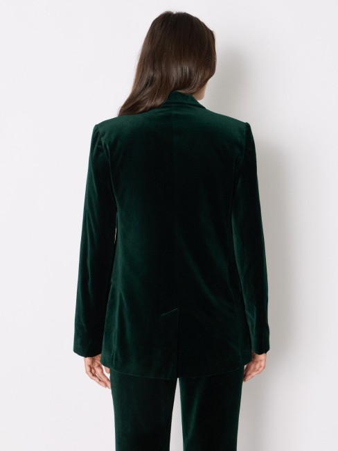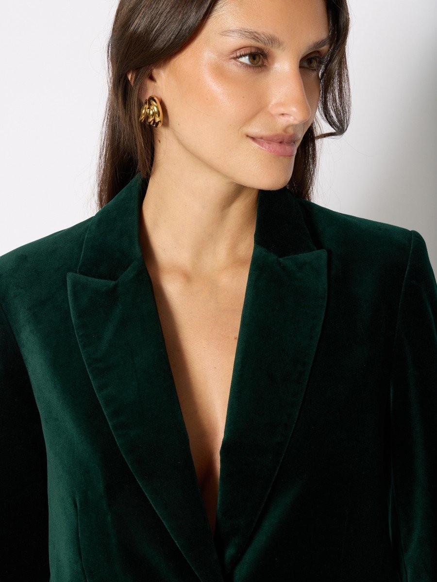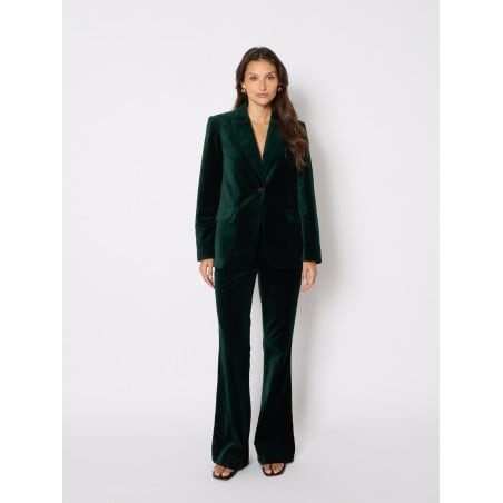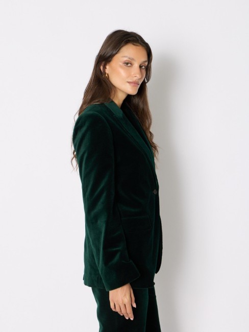 Élégant et audacieux, le blazer VIVI séduit par sa matière en velours doux et lumineux, dans un vert sapin profond qui capte la lumière. Sa coupe cintrée vient structurer la silhouette tout en apportant une touche féminine au tailoring traditionnel. Pensé pour être porté en ensemble, il s’associe parfaitement au pantalon PERRY coordonné pour un look monochrome ultra sophistiqué, idéal pour les fêtes, une soirée ou un look habillé du quotidien.