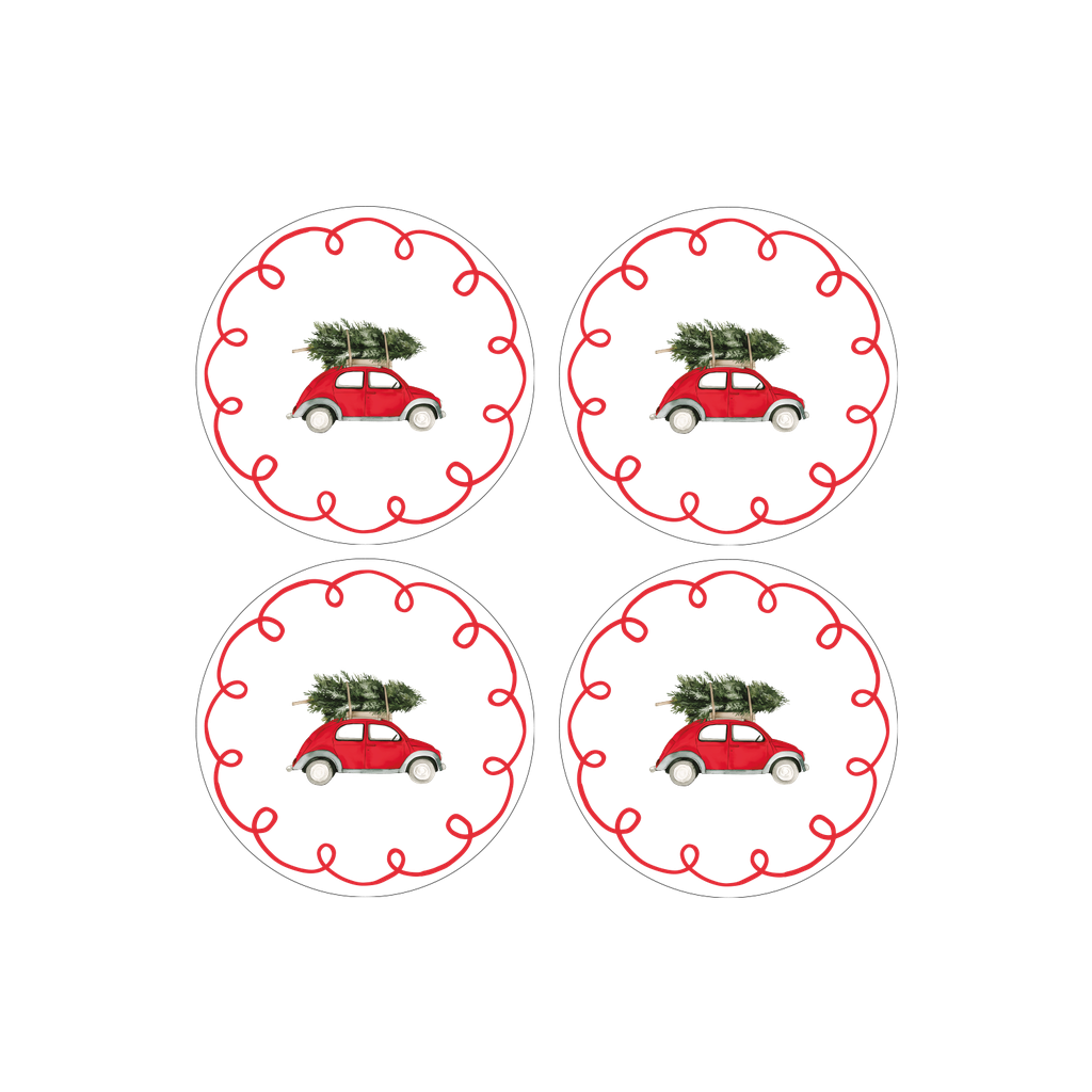 Chaque assiette reprend la même illustration : une petite voiture rouge transportant un sapin, clin d’œil aux traditions et à l’esprit festif de fin d’année.