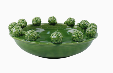 Centre de table en céramique verte, orné de petits artichauts tout autour. Idéale en centre de table pour une touche originale, elle peut accueillir des fruits ou simplement servir d’objet déco.