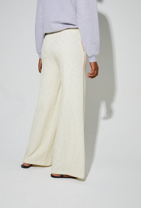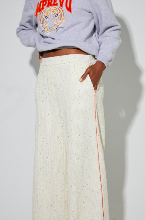- Maille écru parsemée de micro-paillettes multicolores, qui ajoutent une touche d’éclat subtile