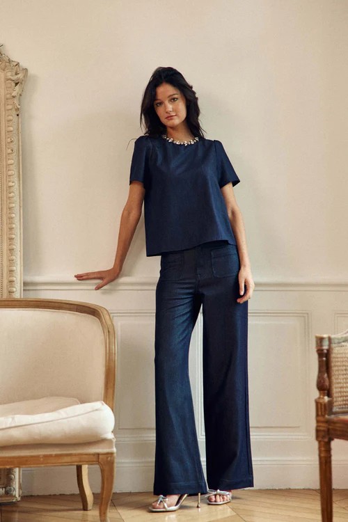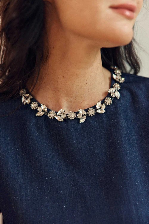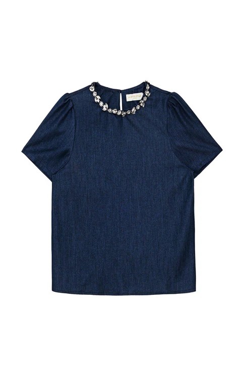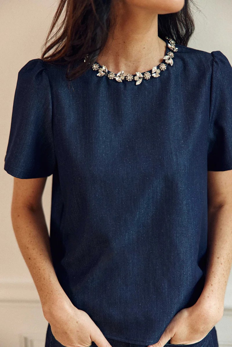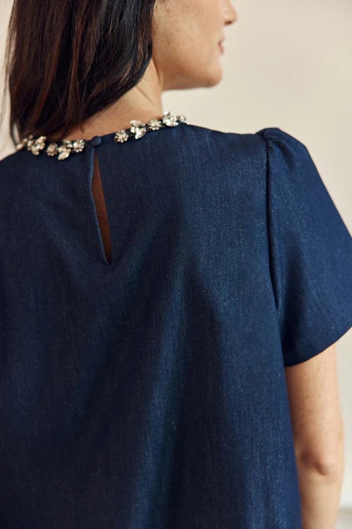 Tylee, un top boxy effet denim lurexé décoré de strass à l’encolure, avec manches courtes et goutte boutonnée au dos, pour une note brillante et moderne.