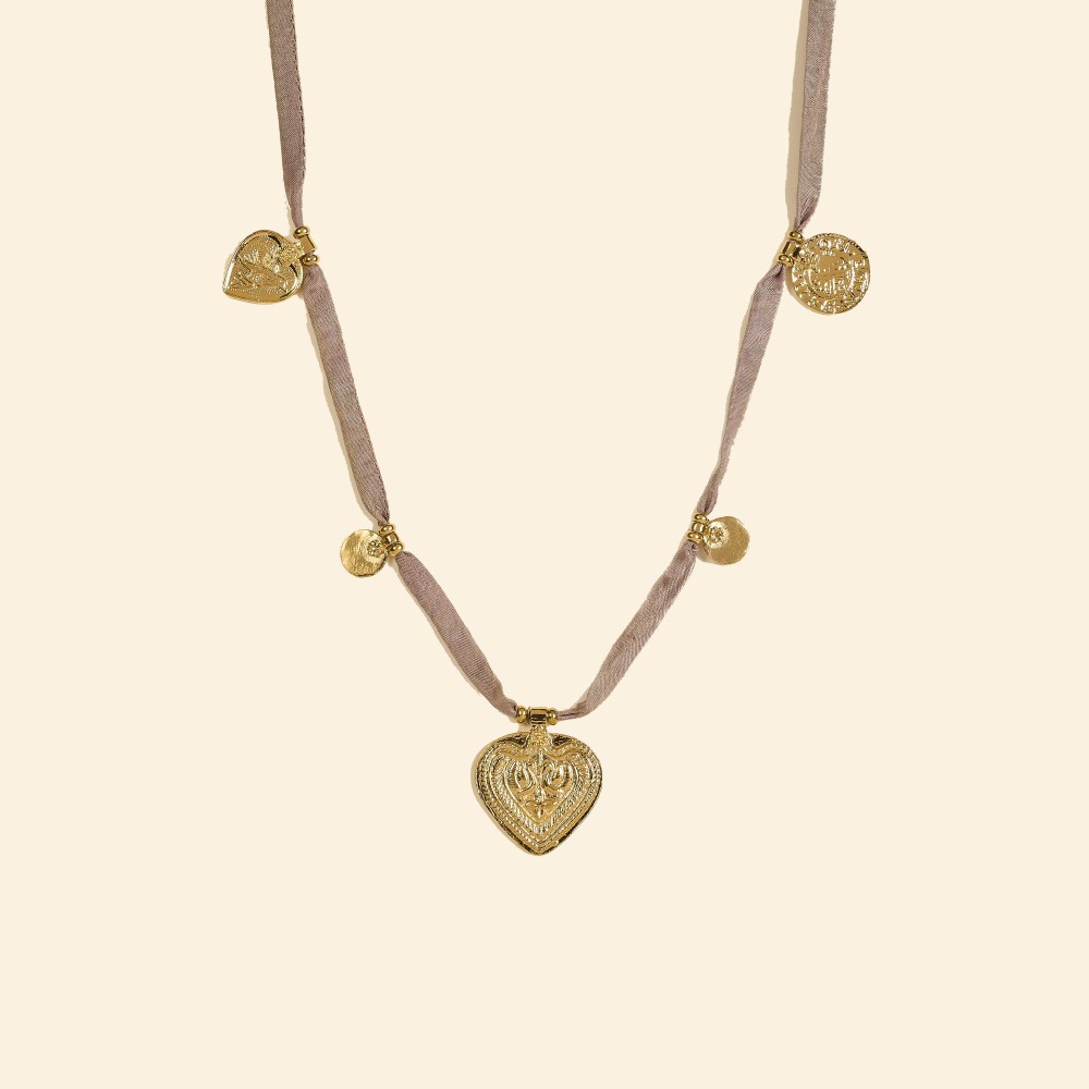 Le collier sautoir Afan By Garance est une composition délicate mêlant plusieurs médailles dorées à l'or fin et un ruban en soie taupe pour un effet raffiné et lumineux.