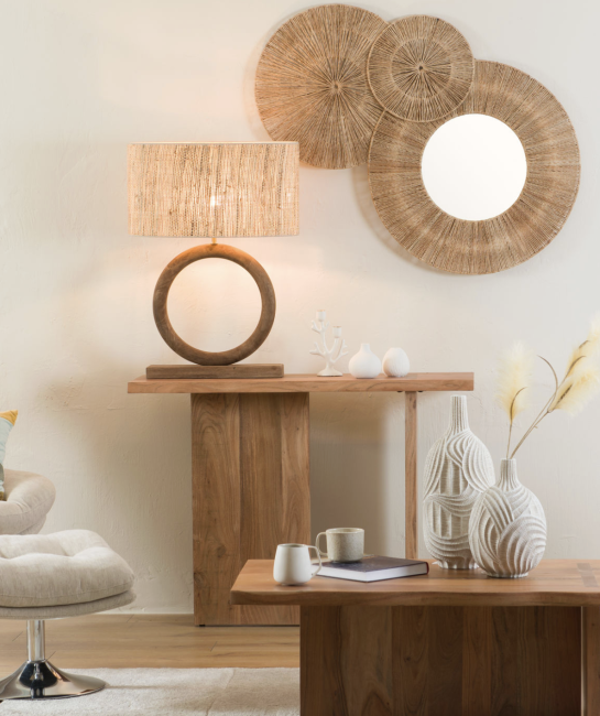 Apportez une touche naturelle et élégante à votre intérieur avec cette lampe de table au pied en bois rond et son abat-jour en raphia tressé.