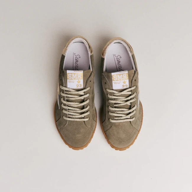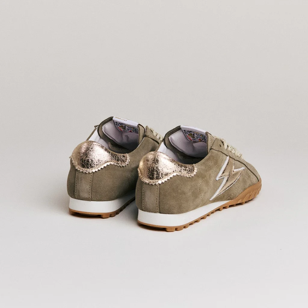 Détail : Semelle crantée et lacets ronds bicolores.