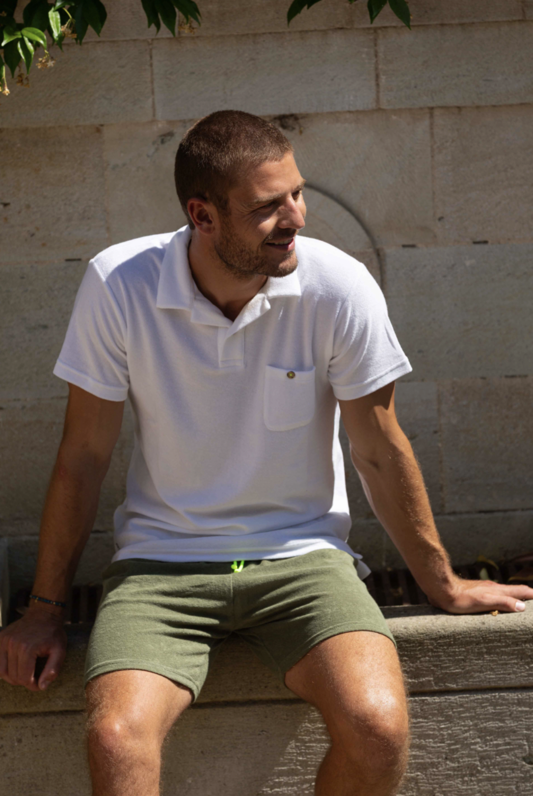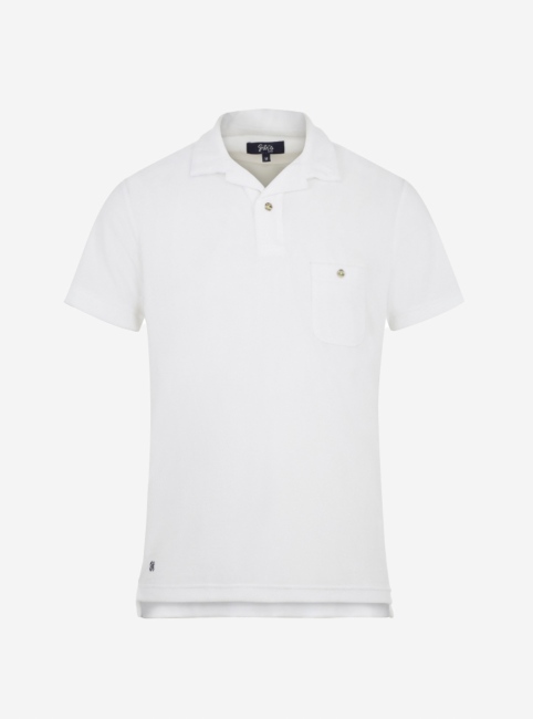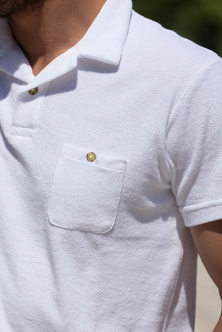 Polo en éponge blanc conçu en coton doux et absorbant, certifié OEKO-TEX. Coupe classique, style décontracté et intemporel. A porter tout au long de la journée.