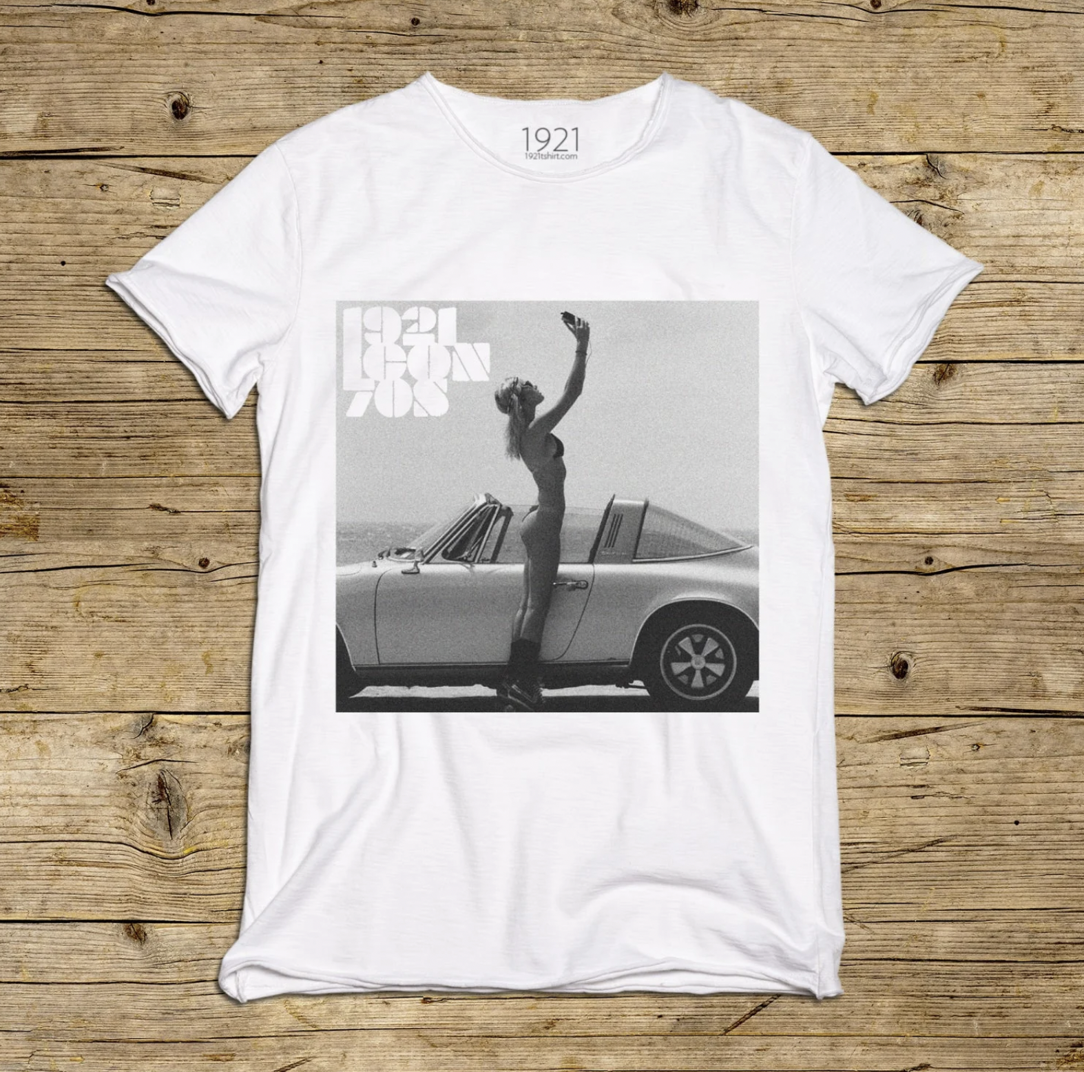 Le noir et blanc texturé souligne le contraste entre les lignes sinueuses du corps et le design rigoureux de la voiture, évoquant les atmosphères dorées de la culture Icon 70s de 1921.