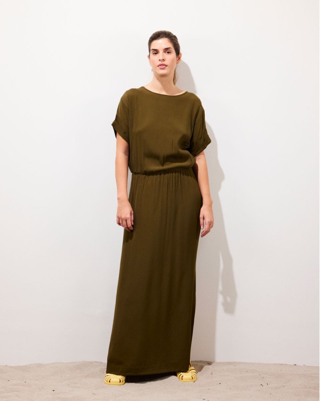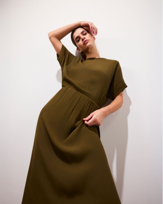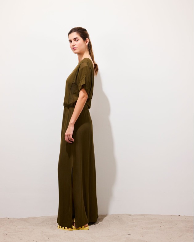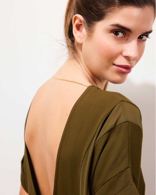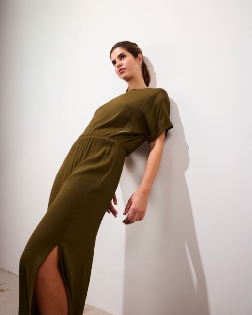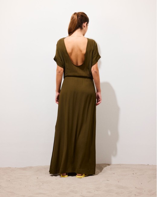 DEUS est une robe longue fluide dos nu, à la coupe volontairement ample, pensée pour laisser le corps évoluer en toute liberté. Dès qu’on l’enfile, son volume blousant et sa taille délicatement marquée par un élastique créent unesilhouette naturelle, sans effort. À l’arrière, l’encolure en Udévoile le dos avec une délicate chaîne dorée amovible, tandis que les manches courtes à revers apportent une décontraction maîtrisée. Le jeu de transparence sur les côtés structurent la ligne et allongent la silhouette, tandis que la fente sur le côté accompagne chaque pas. Une robe fluide et sensuelle, pour les femmes qui aiment conjuguer aisance, présence et élégance solaire.Robe longue fluide dos nu :