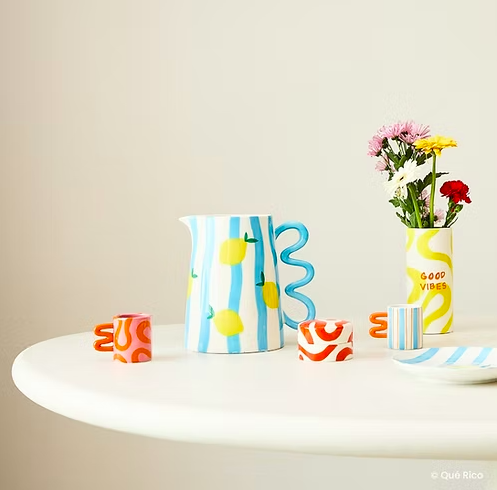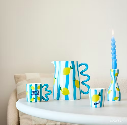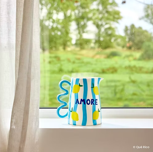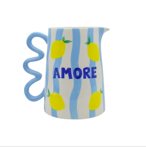 Ce pichet en céramique évoque instantanément la dolce vita méditerranéenne. Ses rayures bleu ciel, ponctuées de citrons jaunes peints, apportent fraîcheur et légèreté, tandis que l’inscription “Amore”, en bleu profond, ajoute une note affectueuse et expressive. Sa anse ondulée originale, assortie aux rayures, assure une prise en main confortable tout en renforçant son style graphique. Sa finition brillante met en valeur les couleurs vives et les détails du décor. Parfait pour servir de l’eau, des jus, des boissons fraîches ou même comme objet décoratif détourné (vase, ustensiles), il s’intègre aussi bien dans une cuisine colorée que sur une table estivale. Un pichet décoratif et fonctionnel, idéal pour insuffler soleil et bonne humeur à vos moments de partage. Emballage cadeau inclus.