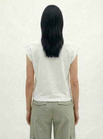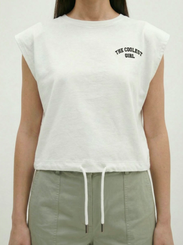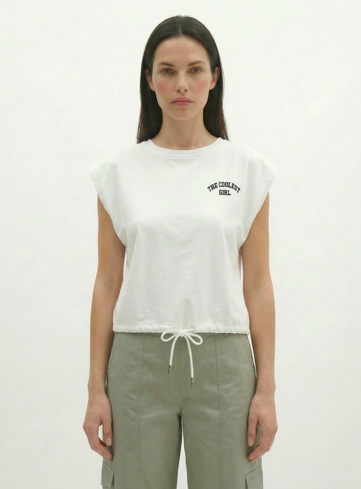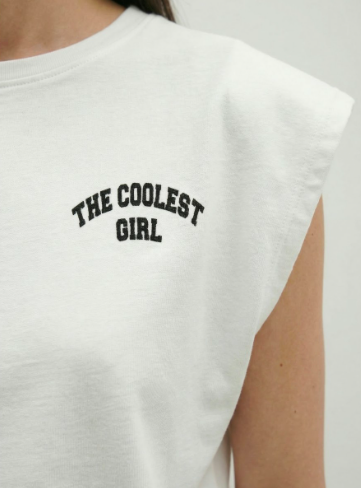 Ce t-shirt sans manches en matière sweat allie confort et style moderne grâce à son cordon à la taille et sa sérigraphie "The Coolest Girl" côté cœur, qui apporte une touche originale et féminine. À porter avec un jean droit ou un short fluide pour un look casual chic estival.