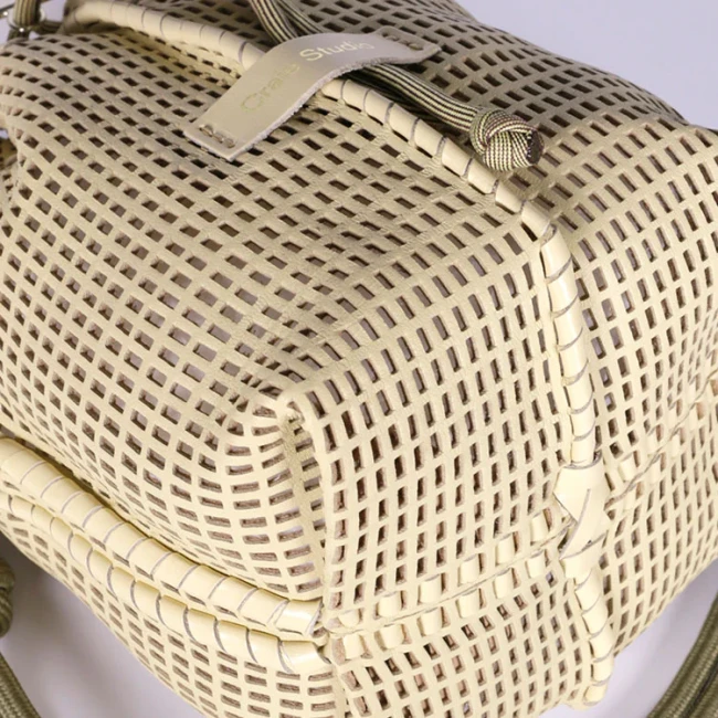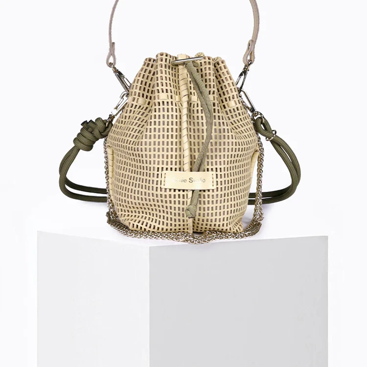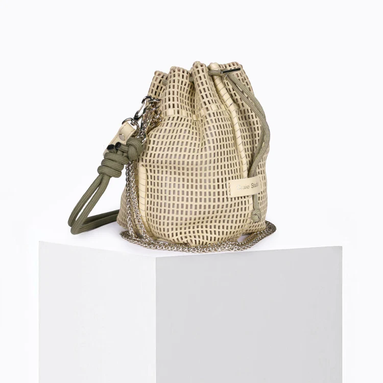 Un mini sac seau en cuir perforé qui allie artisanat, légèreté et modularité, signature de l’univers Craie Studio.