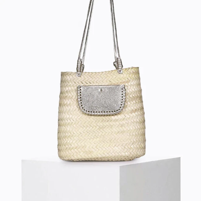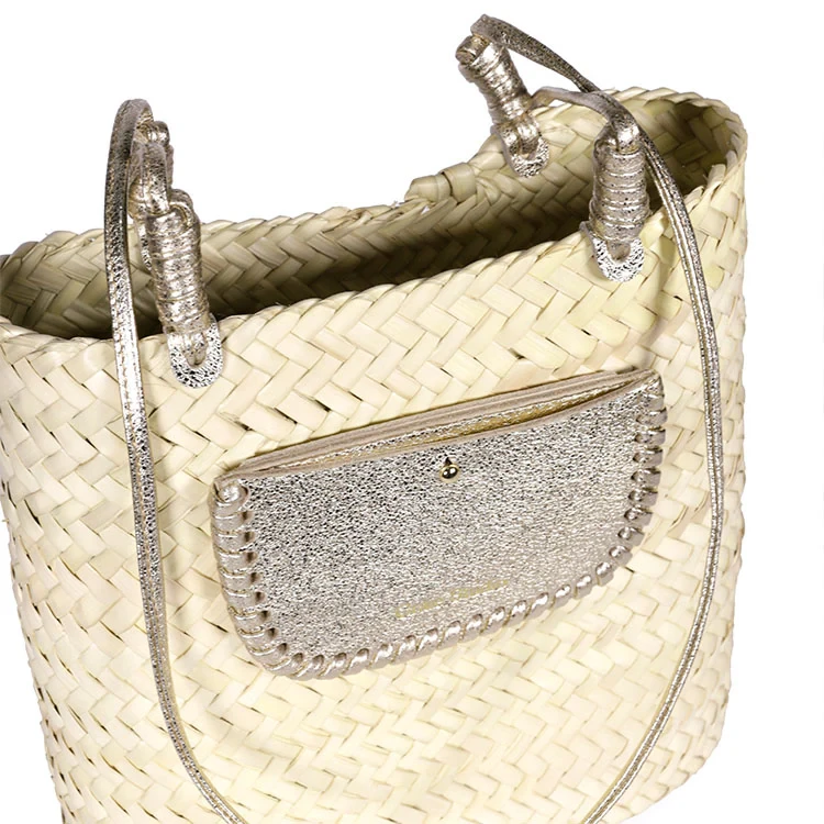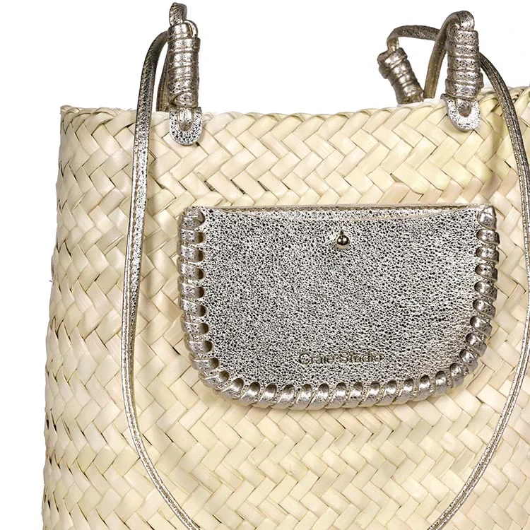 Il associe avec élégance le doum naturel et le cuir d'ageneau or clair, pour un panier à la fois graphique, léger et résolument moderne.