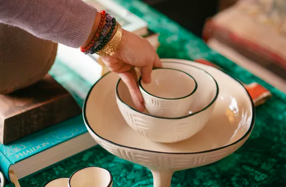 Meet the Kuti’s est une ode au rythme, à la fertilité et au continent africain. Les motifs sculptés dans la céramique ne sont pas le fruit du hasard : ils symbolisent la fertilité. Dans les cultures traditionnelles, des lignes similaires étaient tracées sur les visages comme signes de puissance et de continuité de la vie. Les tons verts sont choisis intentionnellement ; ils évoquent la croissance, le renouveau et une énergie fraîche. Associées à des silhouettes ludiques – des bols reposant sur trois petites pattes – chaque pièce semble danser, comme si le rythme de la musique vivait en elle.