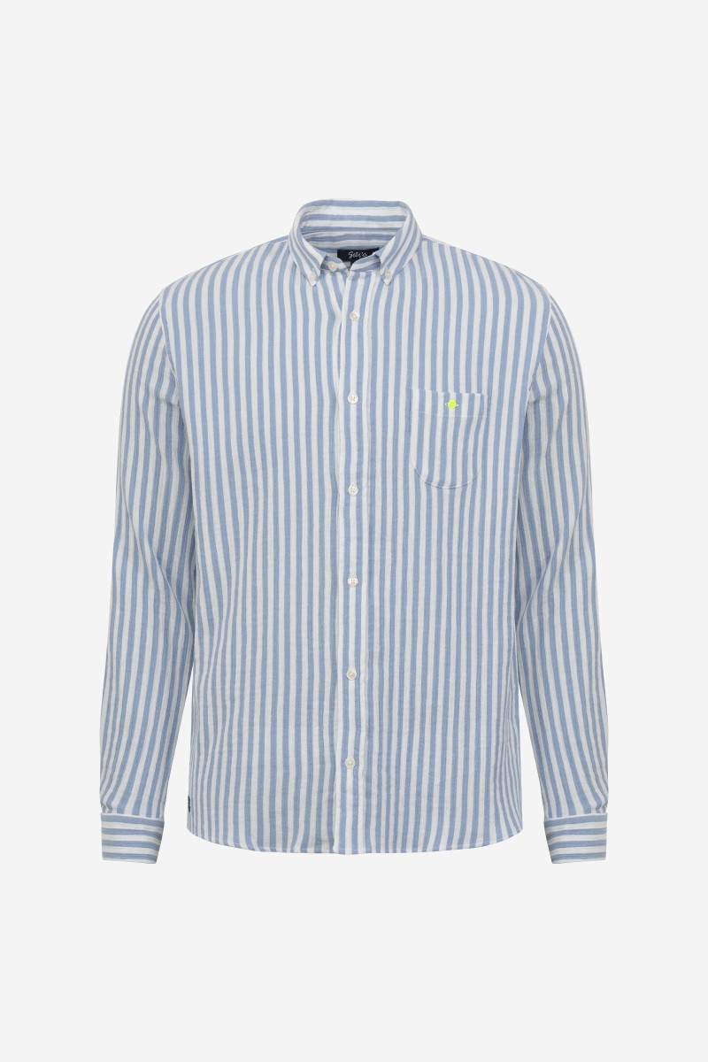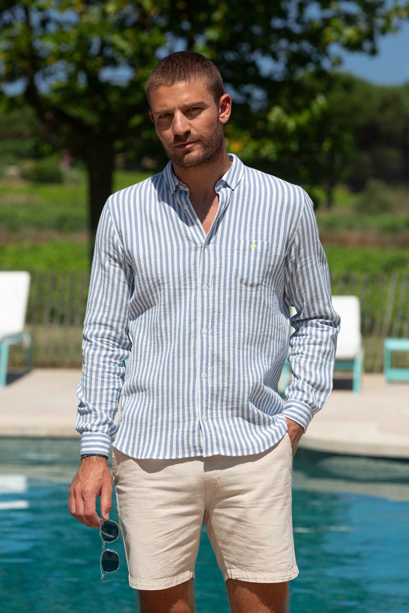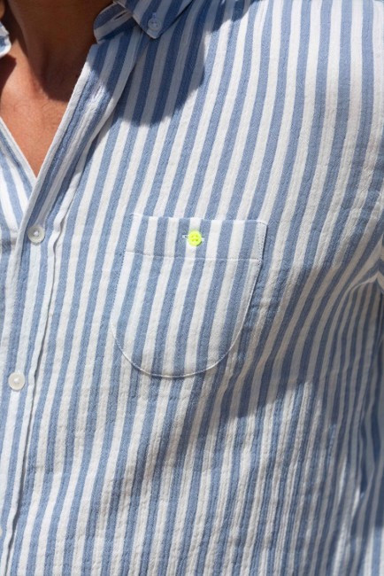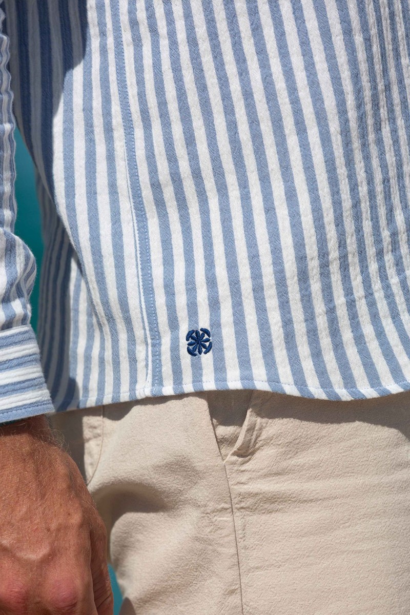Chemise à manches longues rayée en double gaze de coton, dotée d'un col classique. Douce et légère. Son toucher gaufré et vaporeux la rend infiniment agréable et élégante à porter tout au long de la journée.
